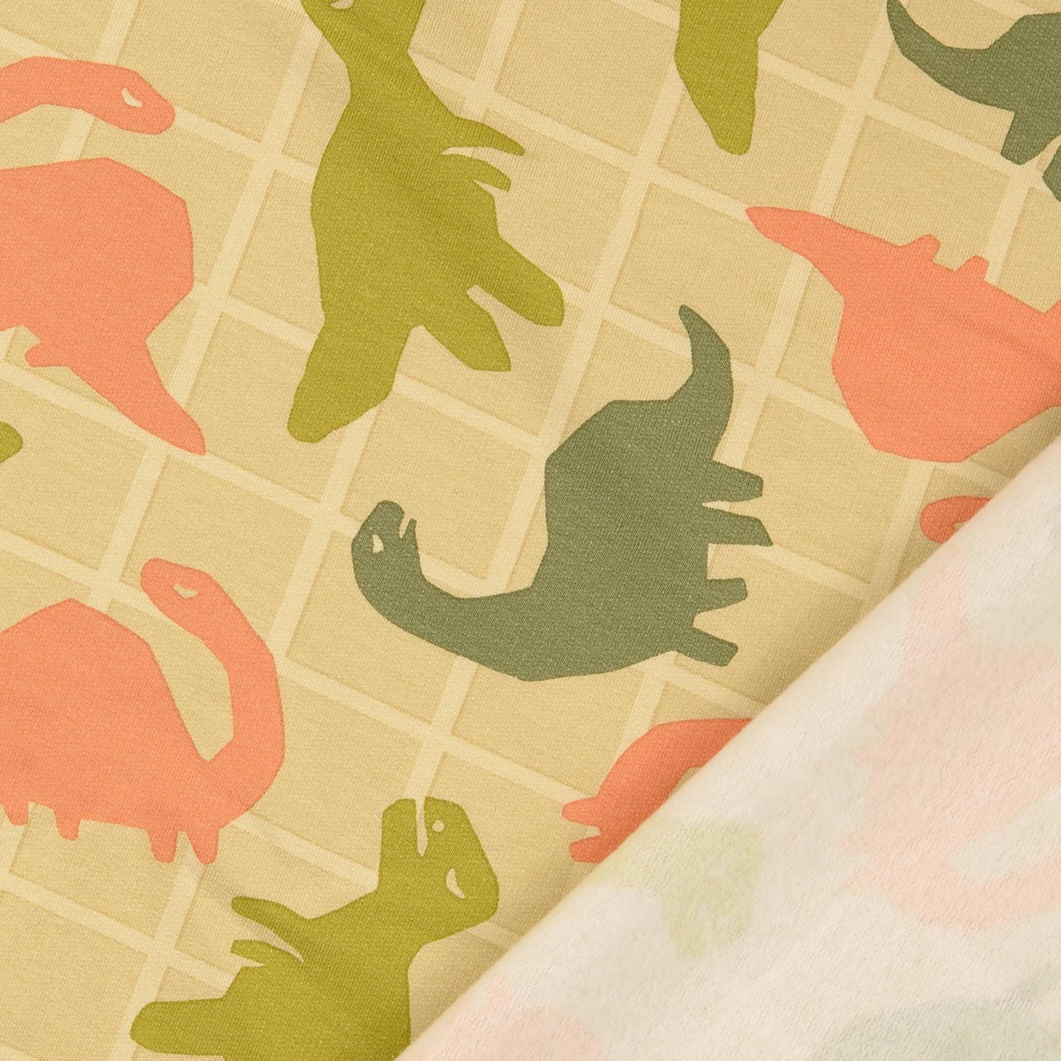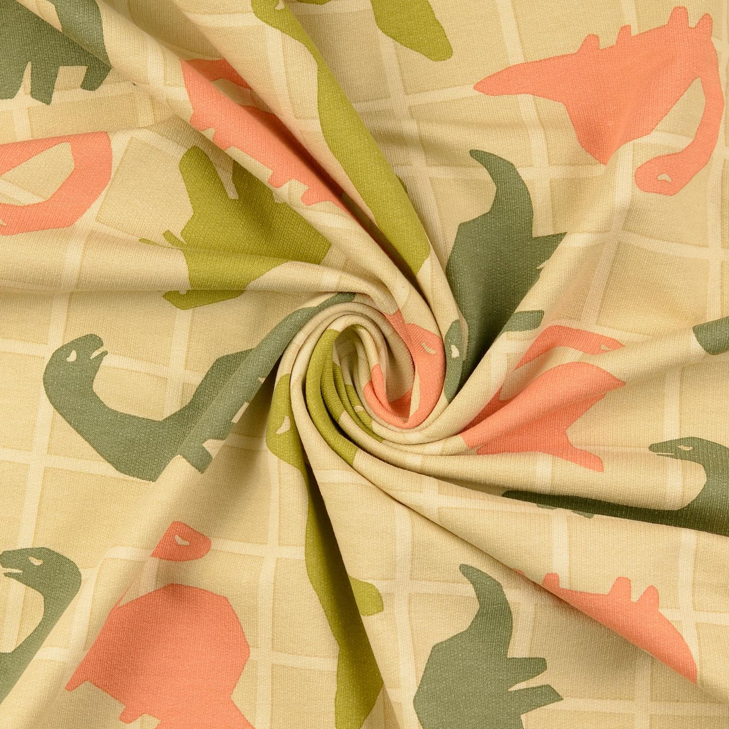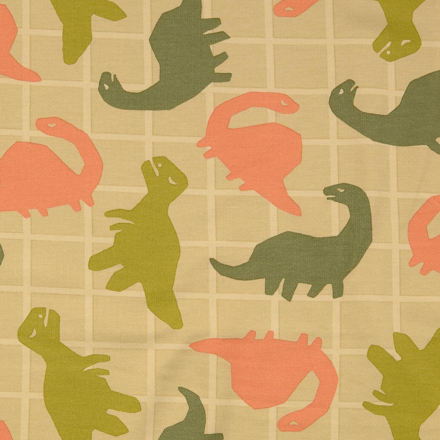 Ett tyg gjort för små och stora dino-fans: På en mjukt melerad beige ton leker glada dinosaurier i fräscht grönt, omgivna av diskreta blad och växtmotiv. De kärleksfullt tecknade dinosaurierna känns vänliga och lekfulla – perfekt för barnkläder som sprider glädje.