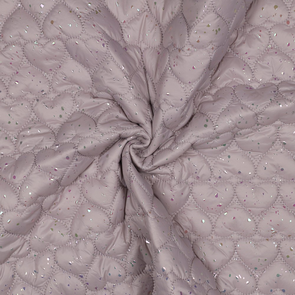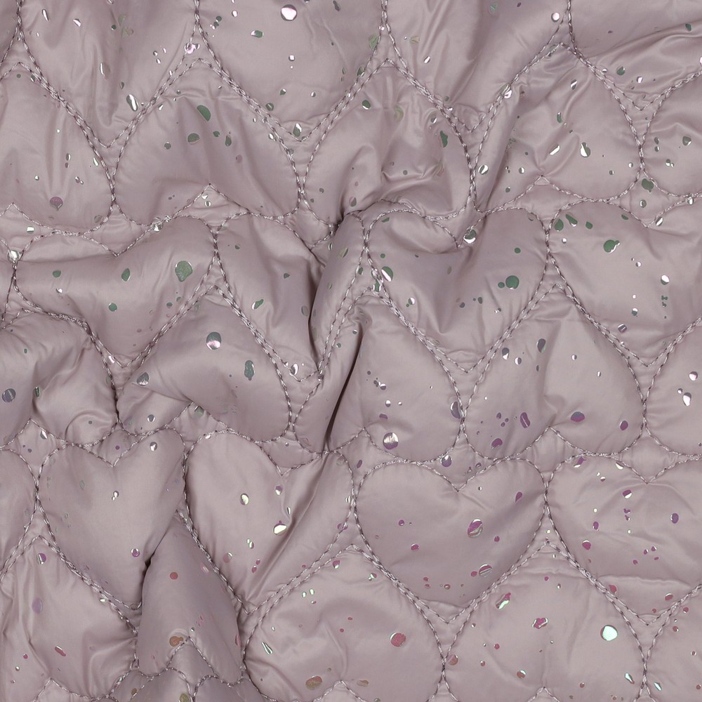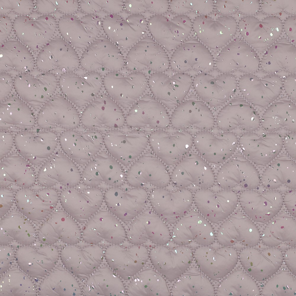 Detta vadderade jacktyg förtrollar med ett hav av glänsande foliehjärtan som kommer vackert till sin rätt på ett mjukt rosa. Hjärtana skimrar lätt metalliskt beroende på ljusets infall och ger dina syprojekt en lekfull, modern look – perfekt för dig som gillar romantiskt men ändå stilfullt.