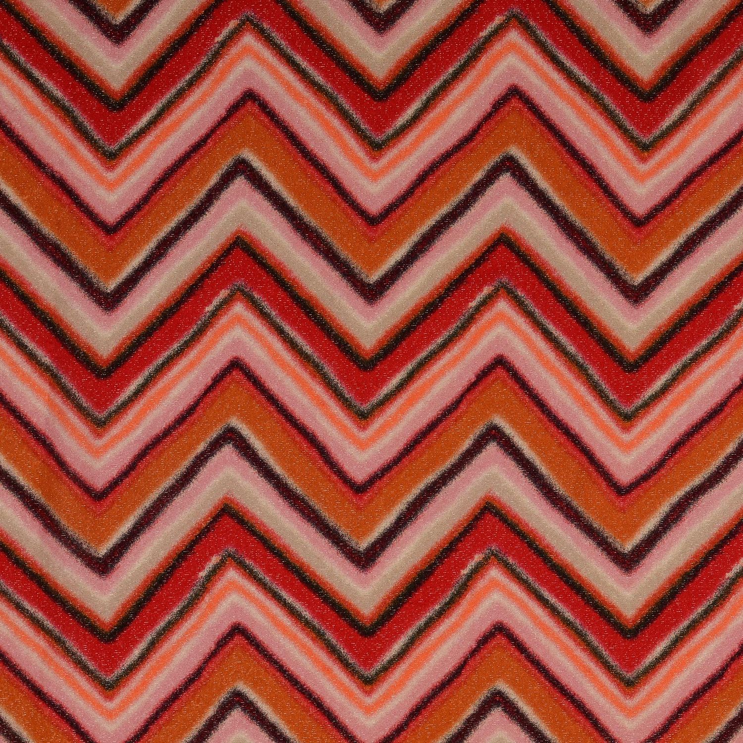 Tyg som ett fyrverkeri: Denna viskos digitaltryck imponerar med ett uttrycksfullt zigzagmönster i intensiva röda och bärtoner, harmoniskt kompletterade med varma orange- och rosanyanser. Fina, invävda Lurextrådar ger designen en ädel glans som diskret glittrar beroende på ljusets infall och ger tyget en glamourös känsla.