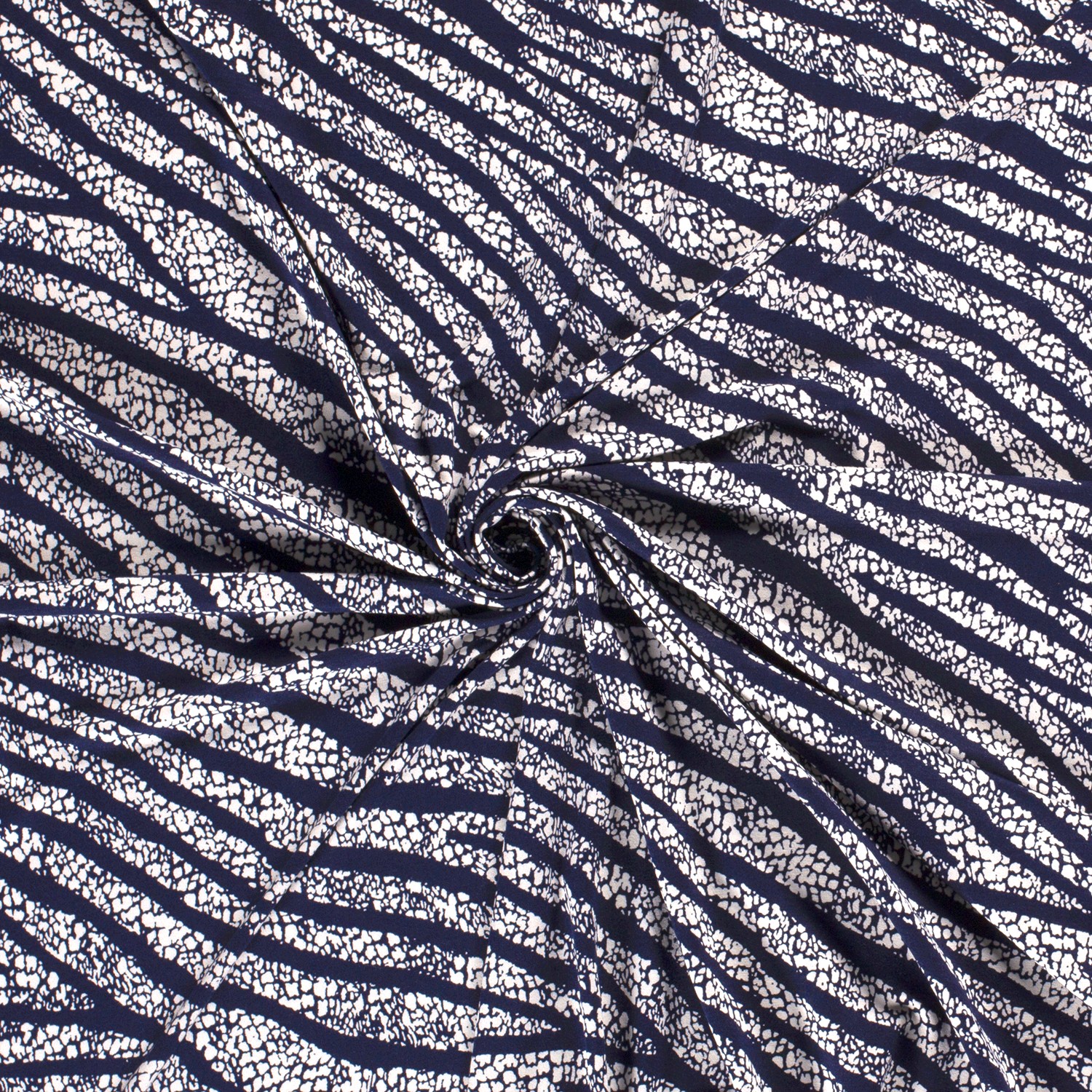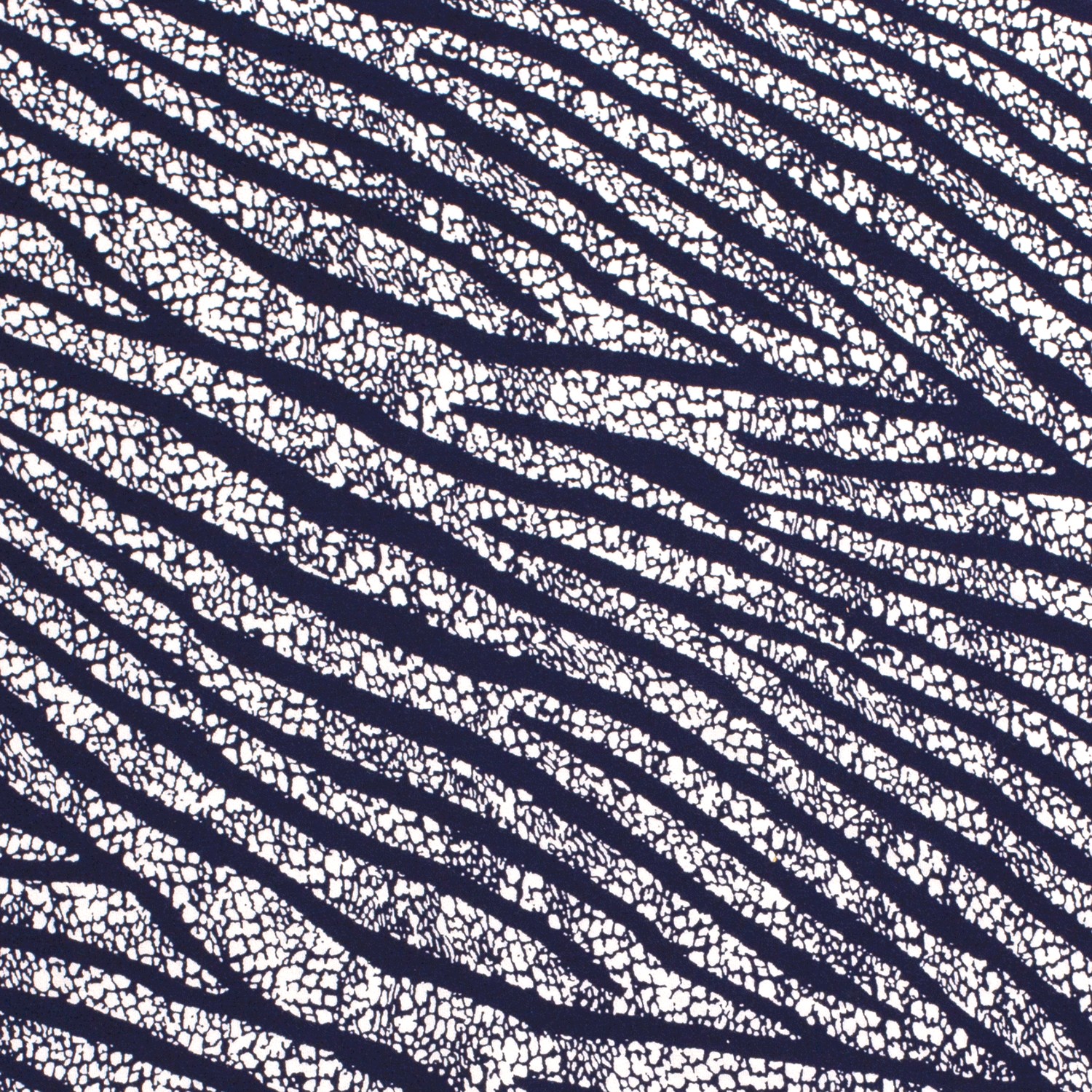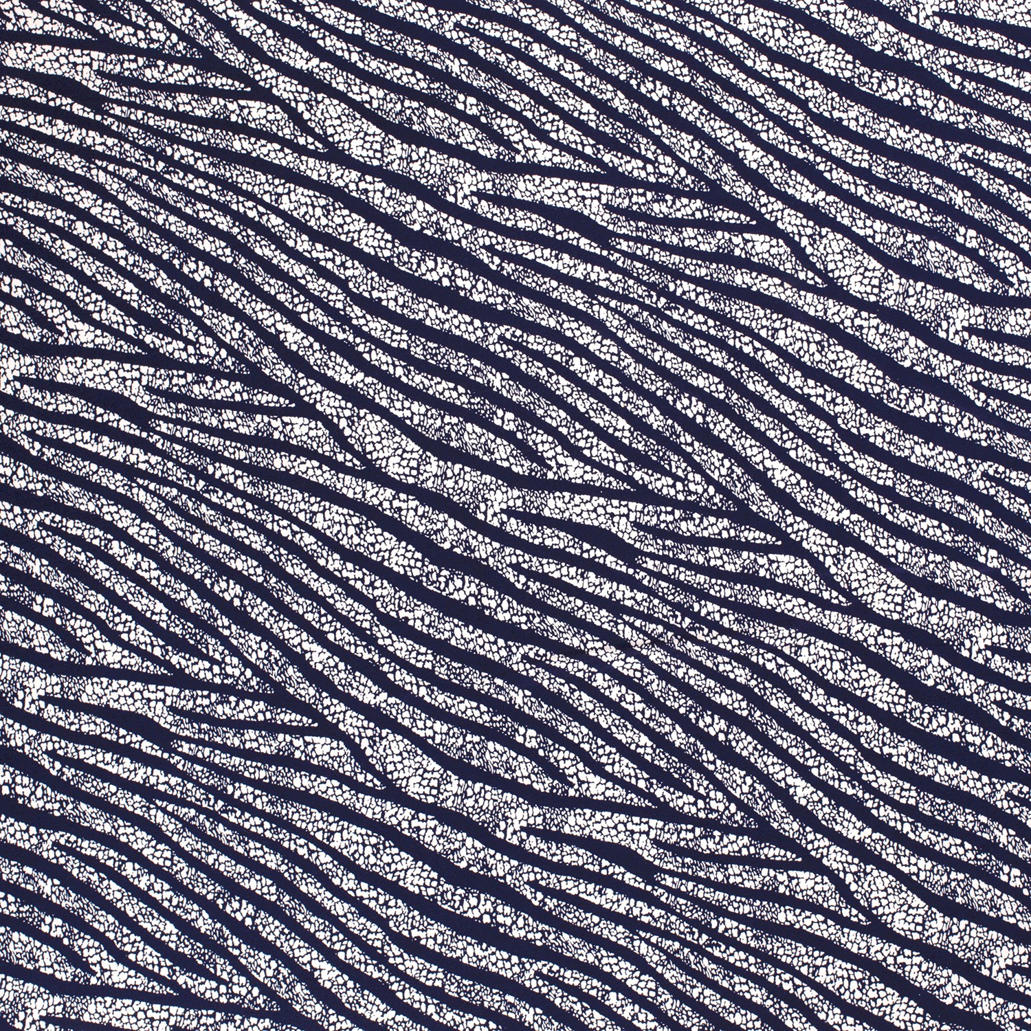 Denna viskosjersey ger en frisk fläkt till din garderob med sin markanta zebrarandiga design. Klara, oregelbundna ränder i vitt och djup mörkblått löper livfullt över tyget och påminner om ett modernt djurmönster – ibland smala, ibland lite bredare, alltid dynamiska och eleganta.