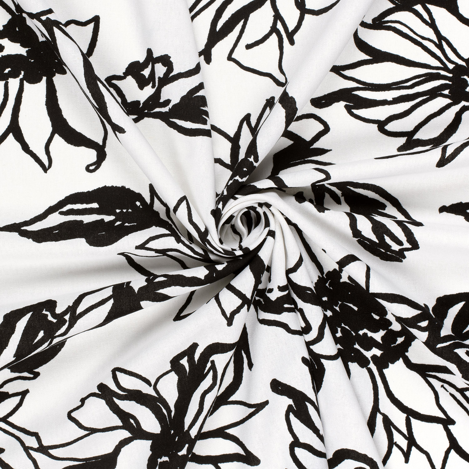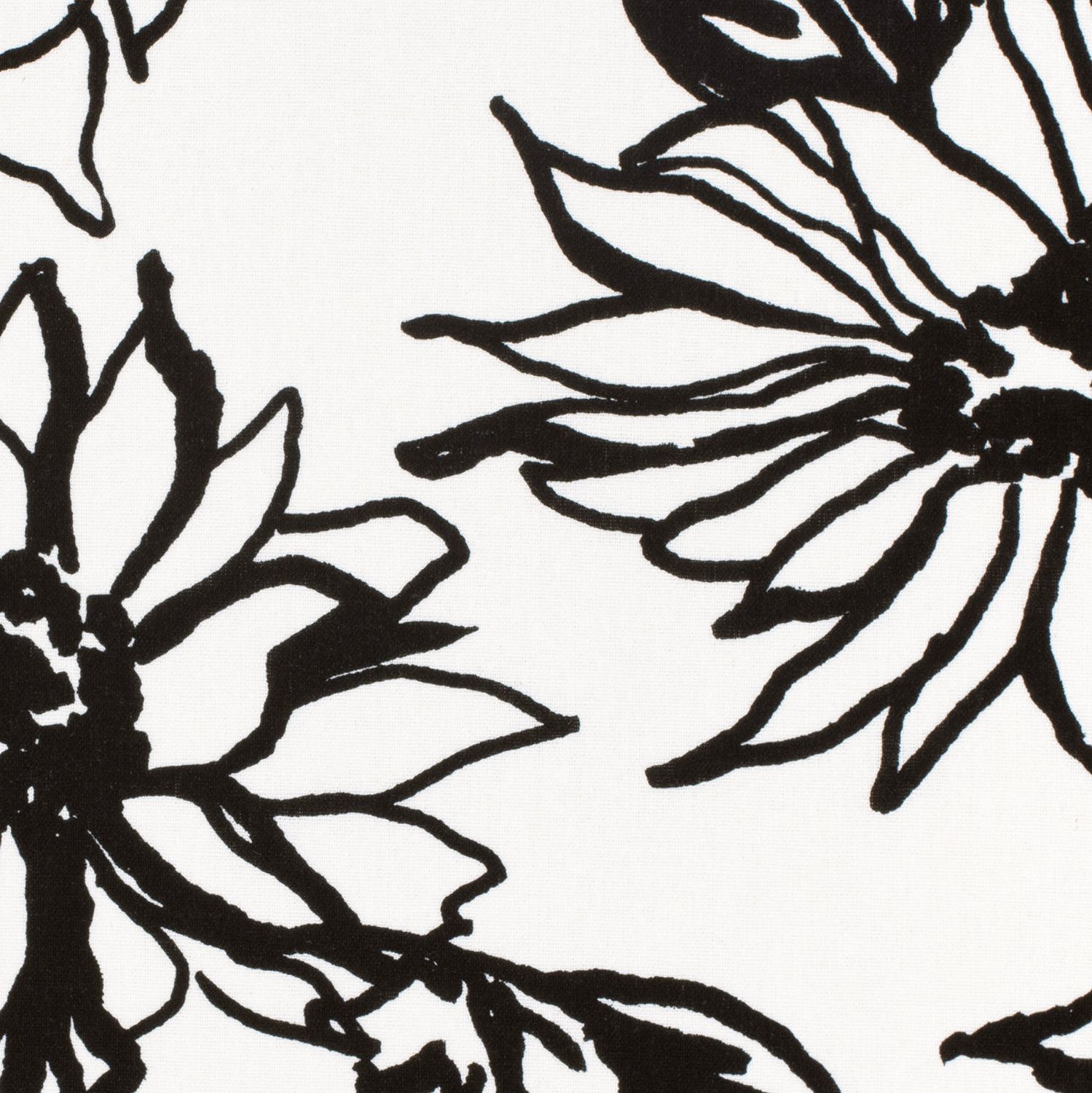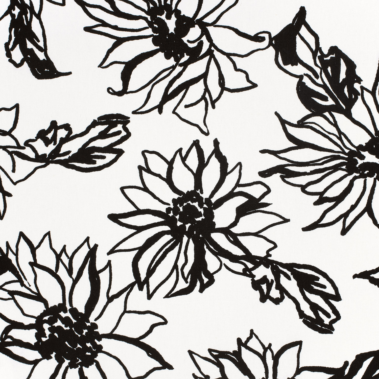 Ett tyg som ett modernt svartvitt fototryck: stora, konstnärligt tecknade blommor i djupsvart utbreder sig på en ljus, gräddvit botten. Kronbladen är detaljrikt skuggade och ser nästan ut att vara målade med bläck, vilket ger en elegant, lätt grafisk touch till designen. Fina linjer och mjuka övergångar ger mönstret ett livligt men ändå lugnt utseende.