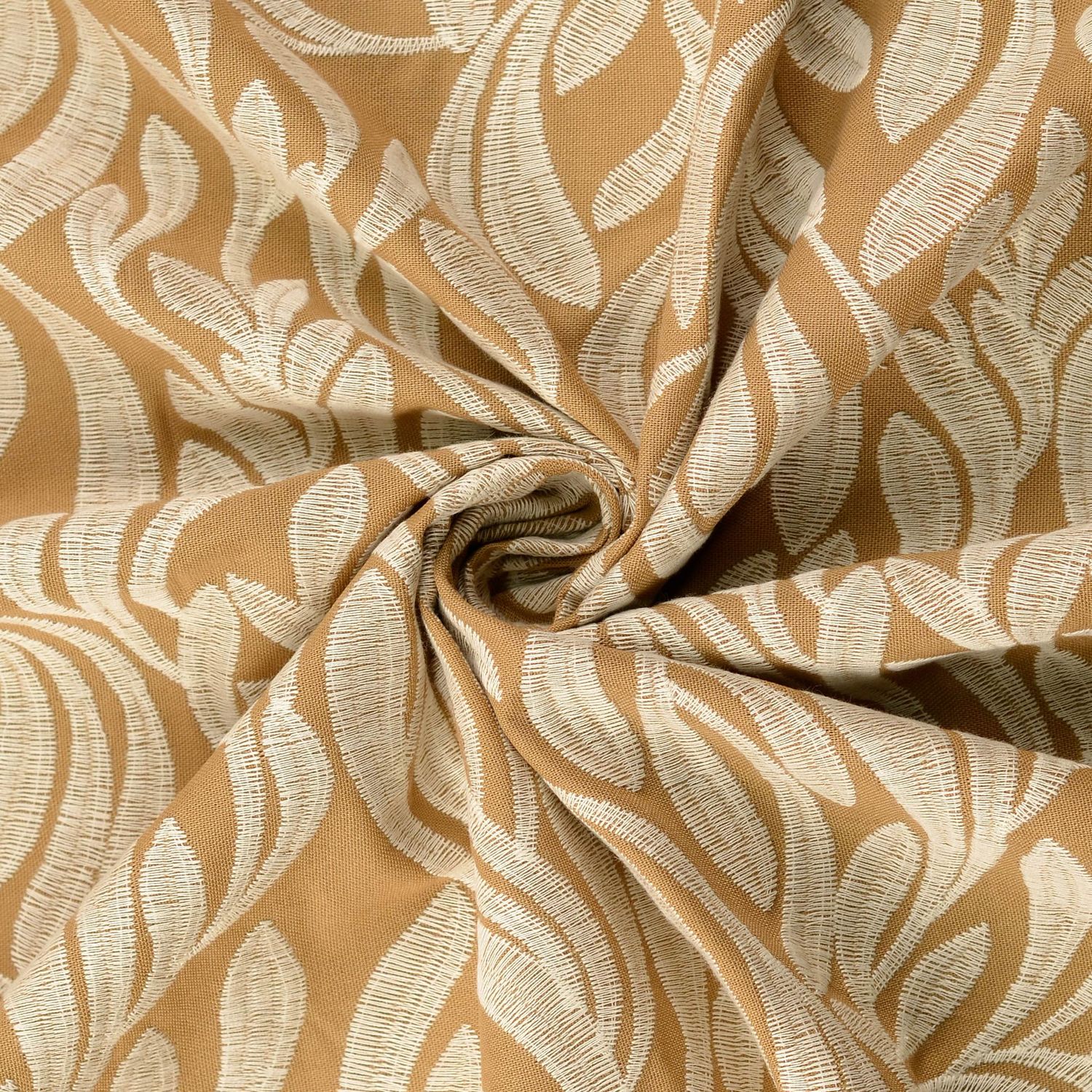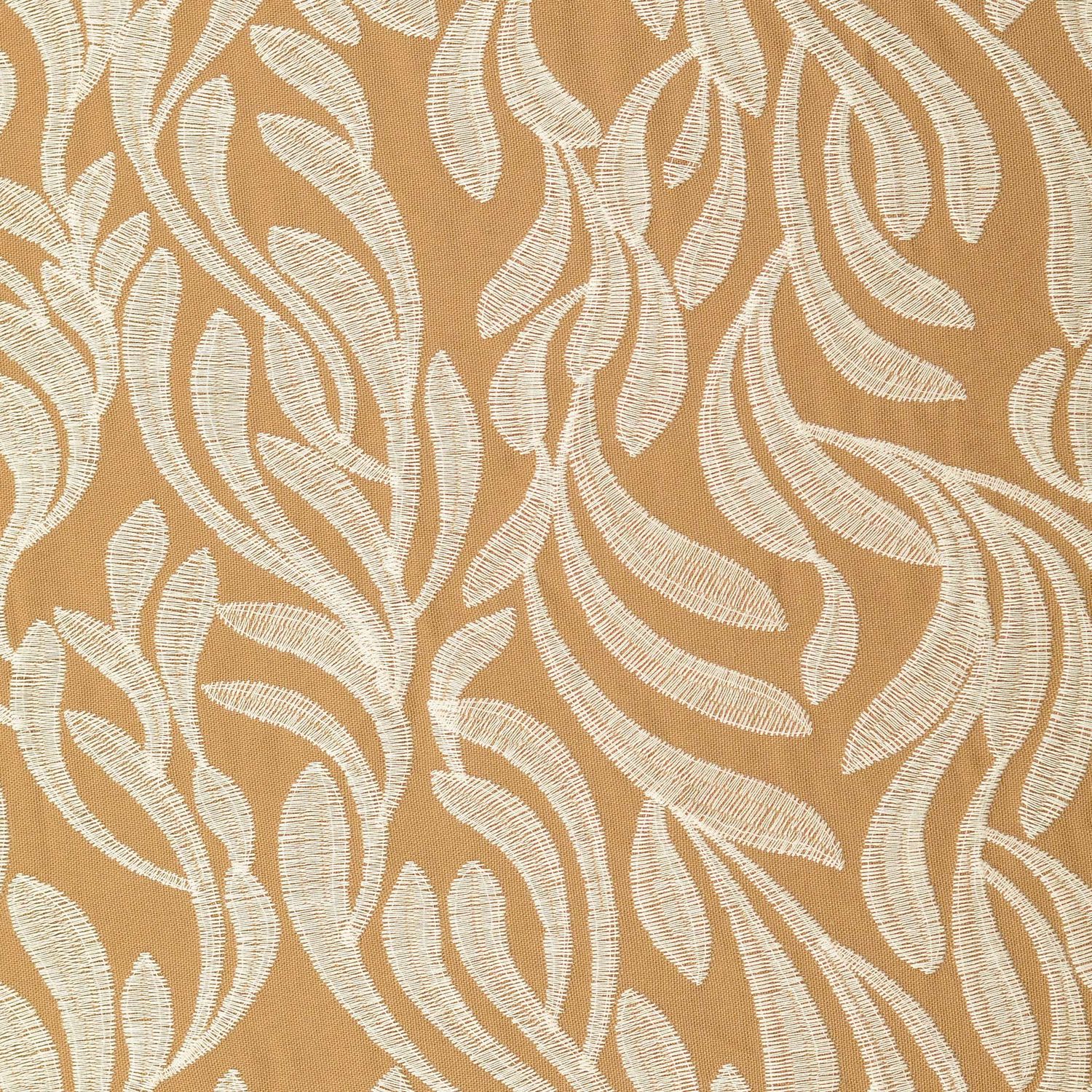 Tyg som en promenad genom höstskogen: På den varma, mellanmörkbruna bakgrunden breder fina, tonade bladbroderier ut sig och ger materialet en ädel, levande struktur. Bladen ser ut som om de varsamt ritats in i tyget – mjuka, naturliga och ändå uttrycksfulla.