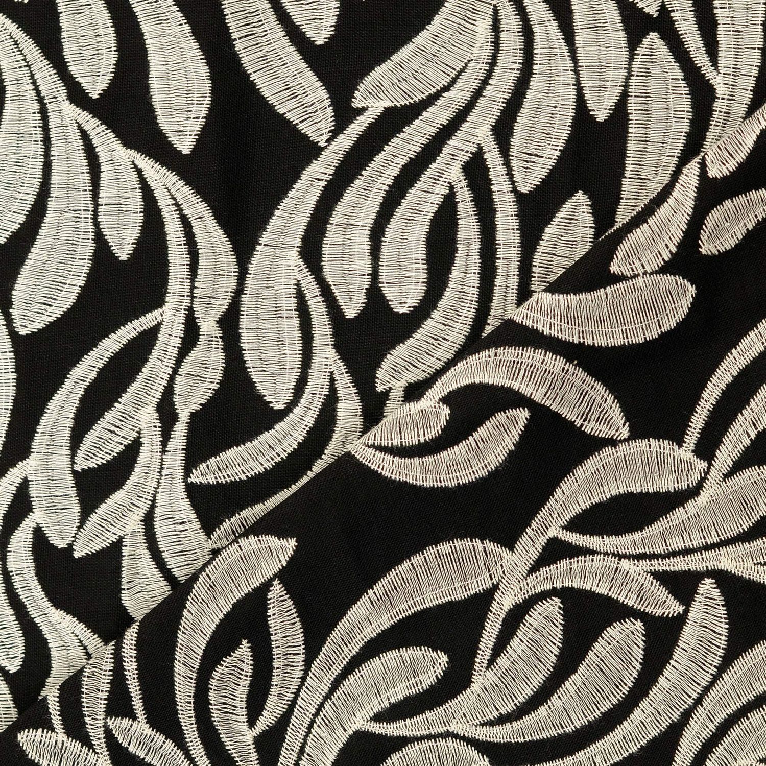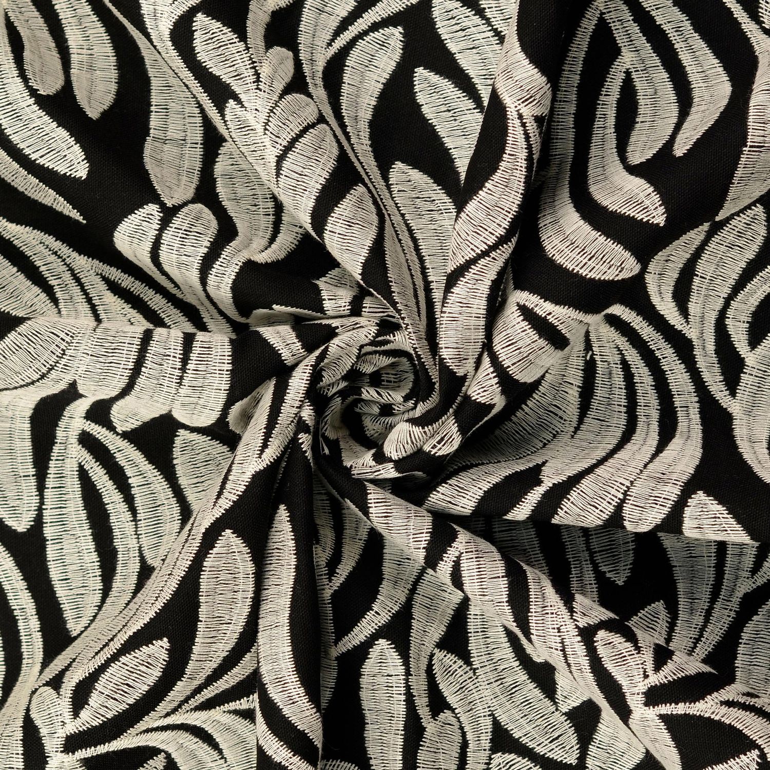 Elegant, tidlös och ändå underbart naturlig – detta svarta viskoselinne förtrollar med ett fint, broderat bladmotiv. Den fina broderingen framträder ton i ton i en elegant svart och ger tyget en diskret struktur som man inte bara ser utan också känner.