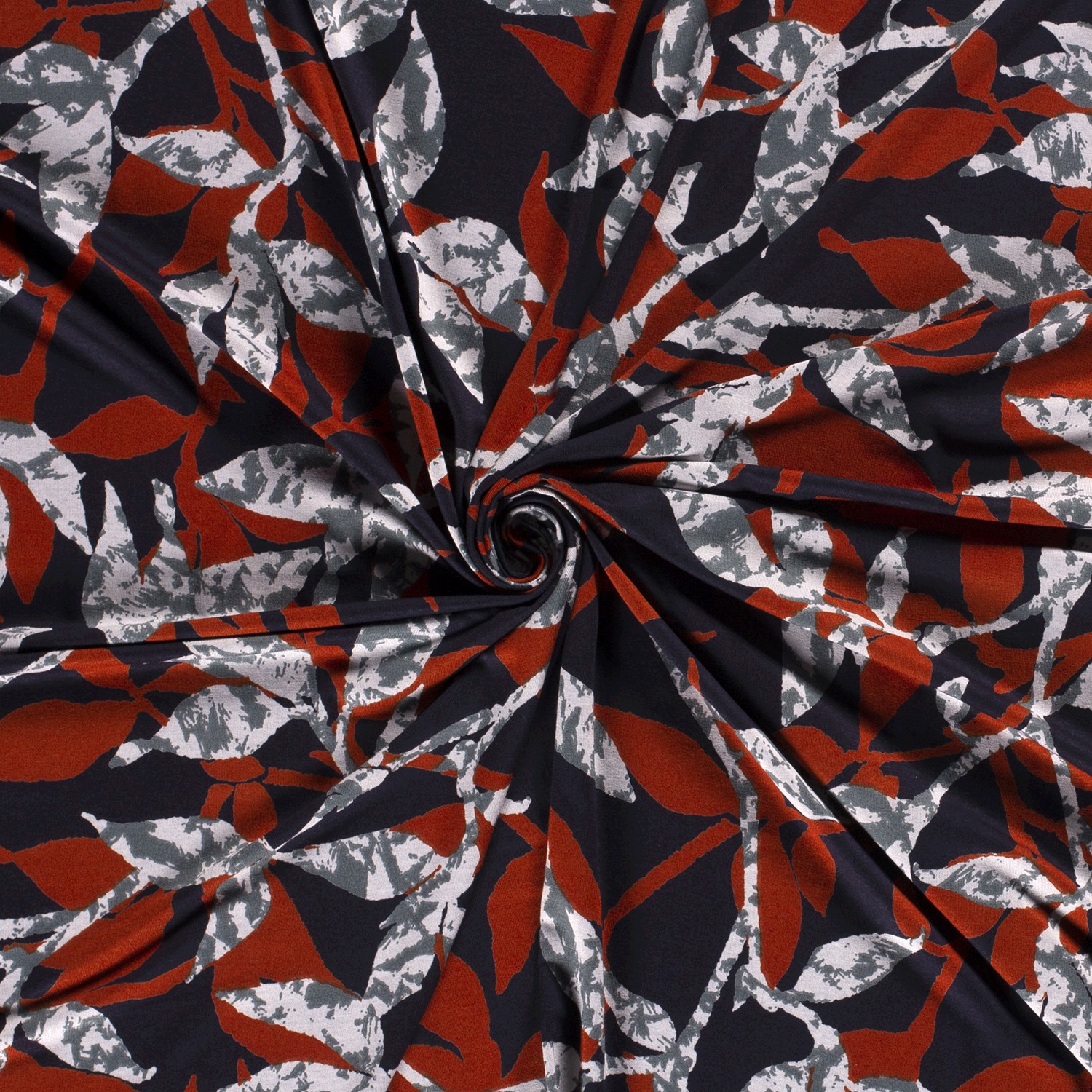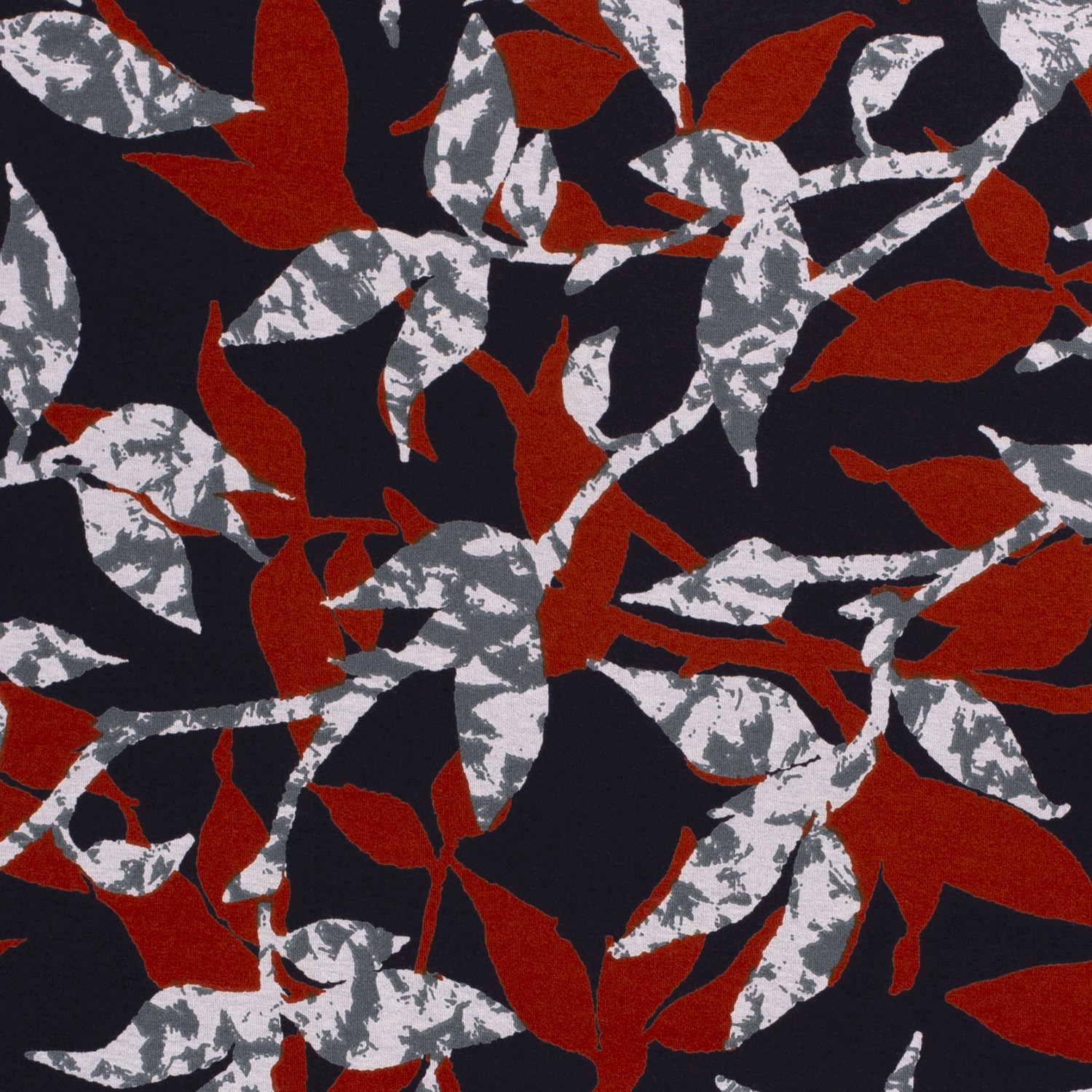 Oavsett om det är som ett blickfång till jeans, en stilfull klänning eller en modig accessoar: med denna viskosjersey i mörkblått med grå-blodorange grenar skapas sömnadsprojekt som sticker ut utan att vara påträngande – tidlösa, eleganta och med en touch av natur.