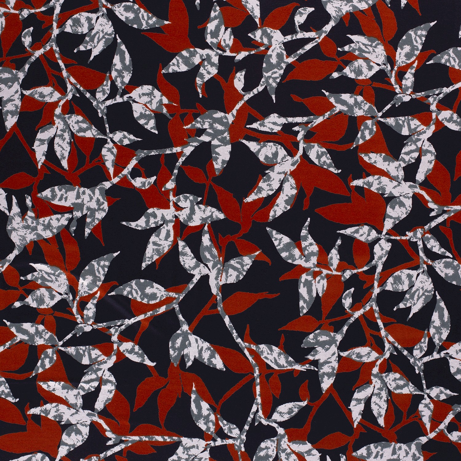 En djup mörkblå bakgrund med ett fint nätverk av ömtåliga grenar i grått och lysande blodorange – denna viskosjersey förenar elegans och modernitet i en unik design. De filigrana grenarna ser nästan ut som tecknade och ger tyget ett levande men ändå lugnt uttryck.