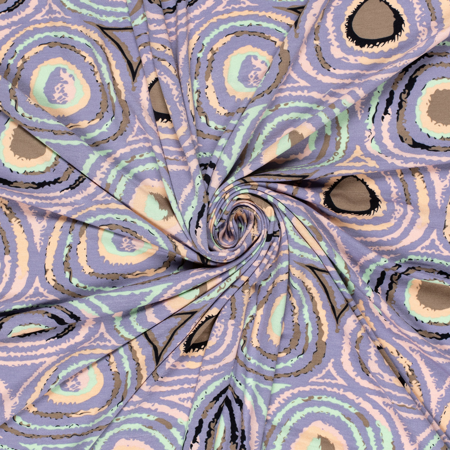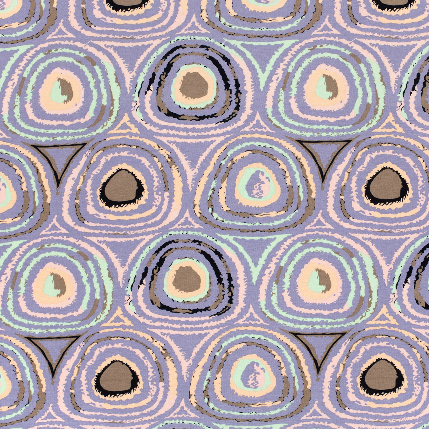 En lekfull dans av cirklar i drömlika lila nyanser: På denna mjuka jersey dansar cirklar i olika storlekar i syren, violett och mjuka rosa toner över en ljus, lugn bakgrund. Fina prickar och lätta skuggningar ger designen ett modernt, nästan grafiskt utseende utan att bli för högljutt.