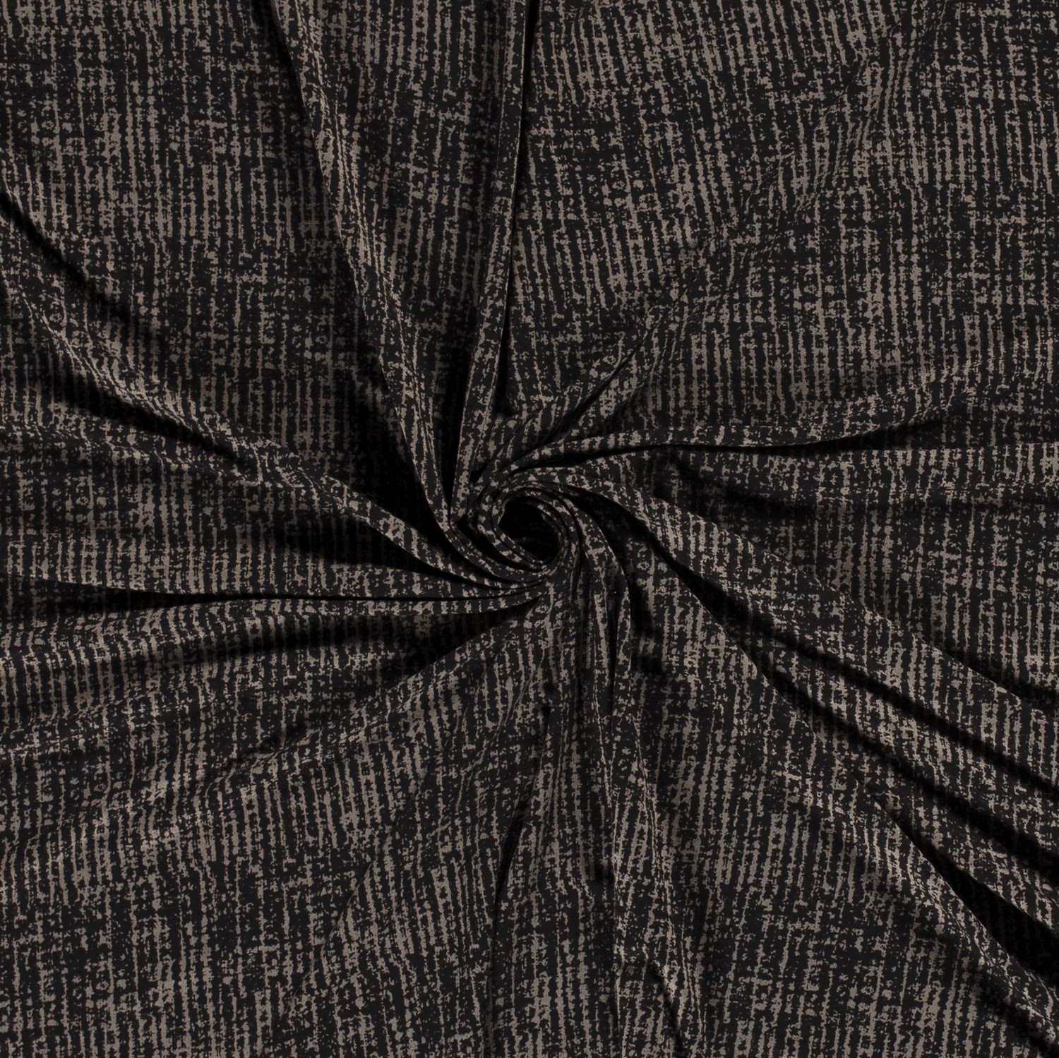 Denna viskosjersey har ett modernt, smalt randmönster i elegant khaki och djup svart. De tunna linjerna ger tyget ett lugnt och klart utseende som är både sportigt och elegant.