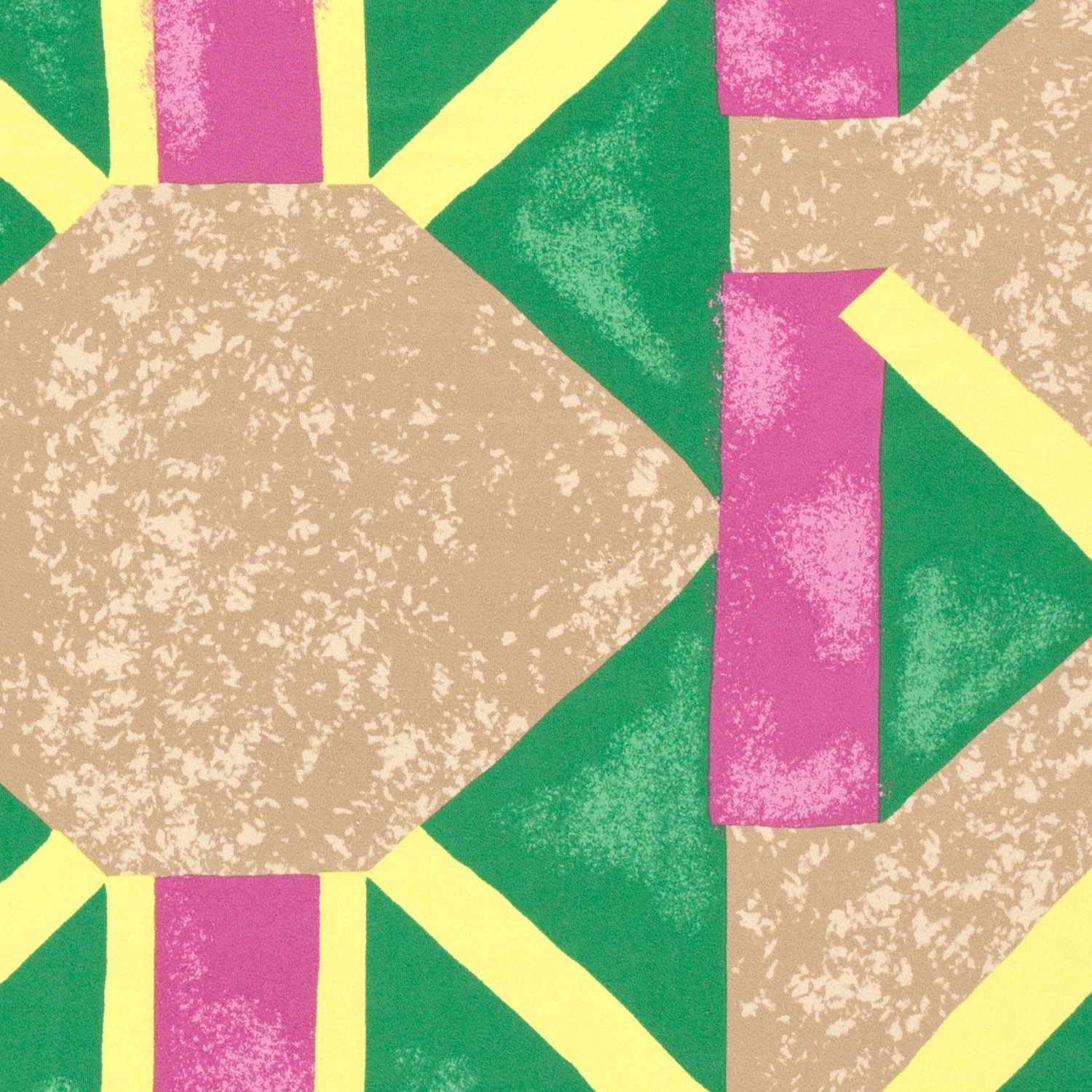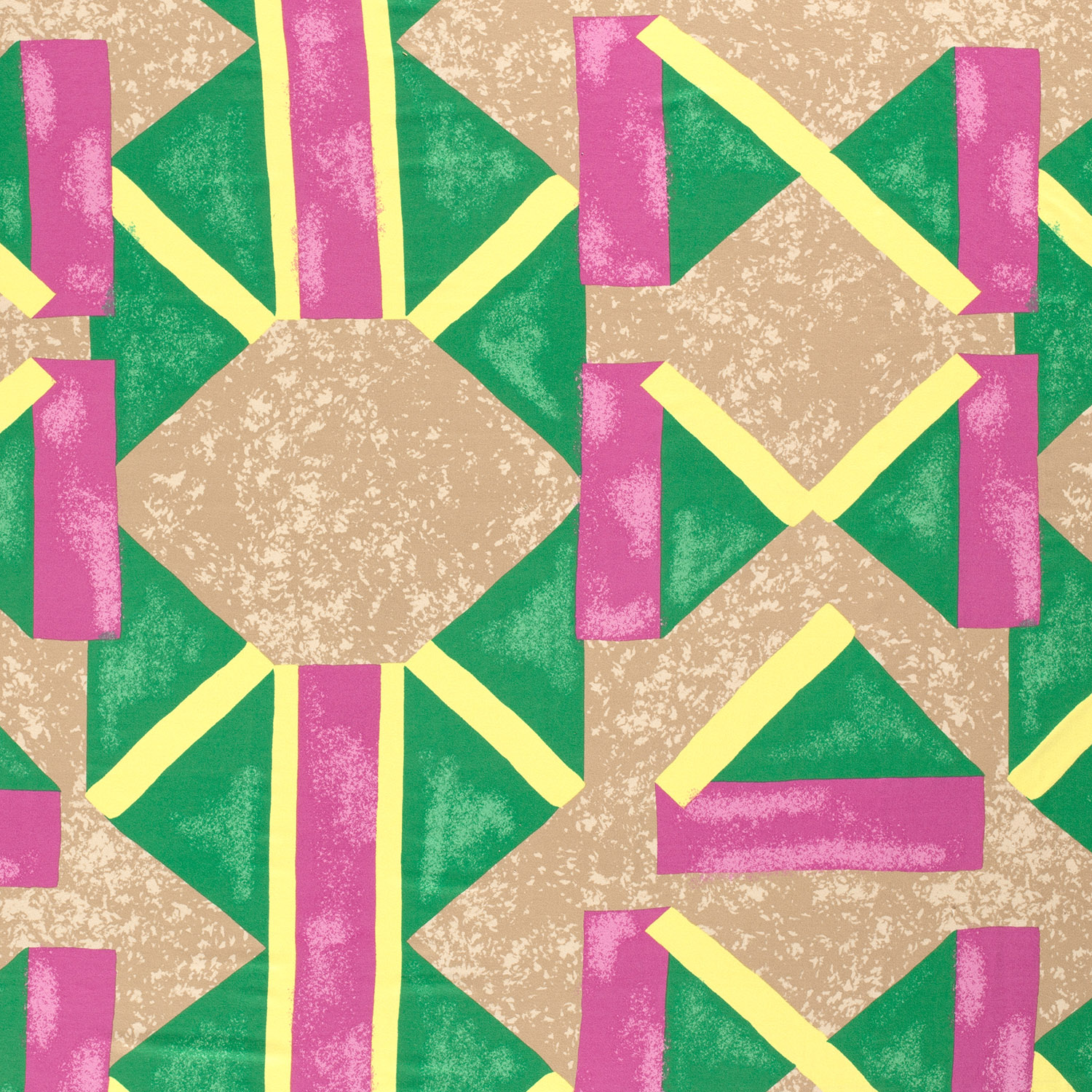 En livfull mönstermix som genast fångar blicken: På en djup grön bakgrund dansar olika mönster i glada multicolor-toner – från varma gula och orange nyanser till friska turkosa och blå toner samt små mörka accenter som ger designen djup.