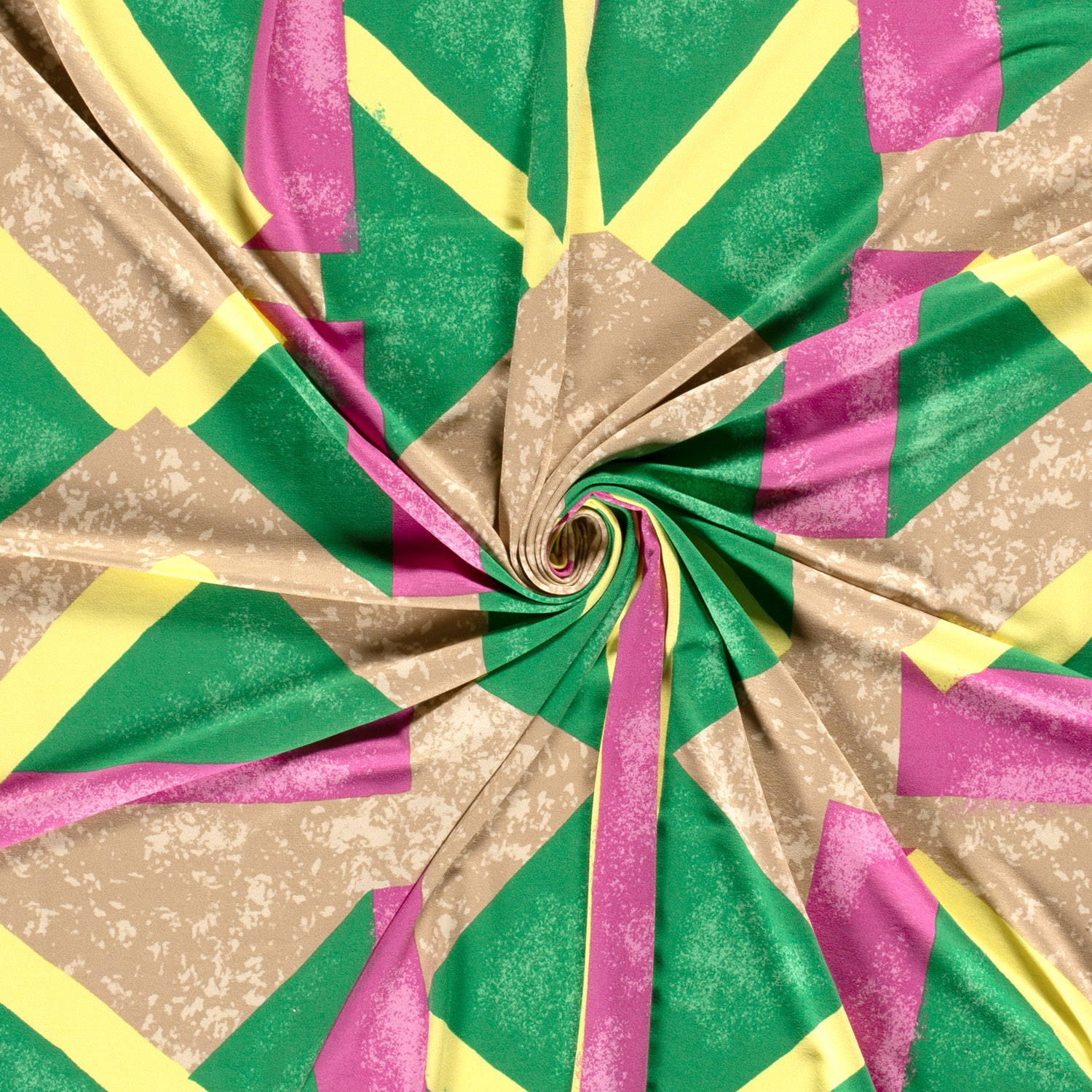 Oavsett om det är flödande klänningar, luftiga toppar, trendiga kjolar eller bekväma byxor – denna viskosjersey tillför färg och dynamik till din garderob och är perfekt för alla som älskar ovanliga mönster och en modern, trendig look.