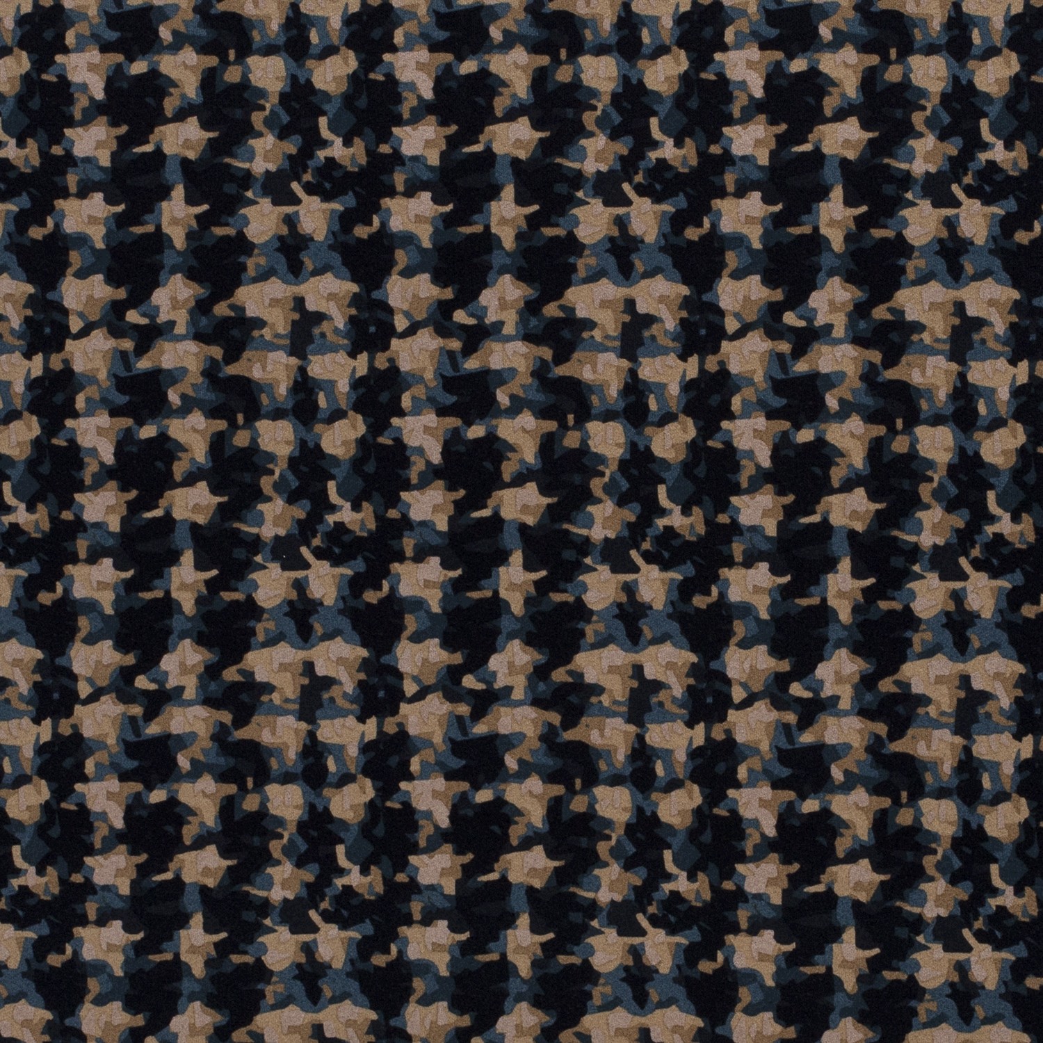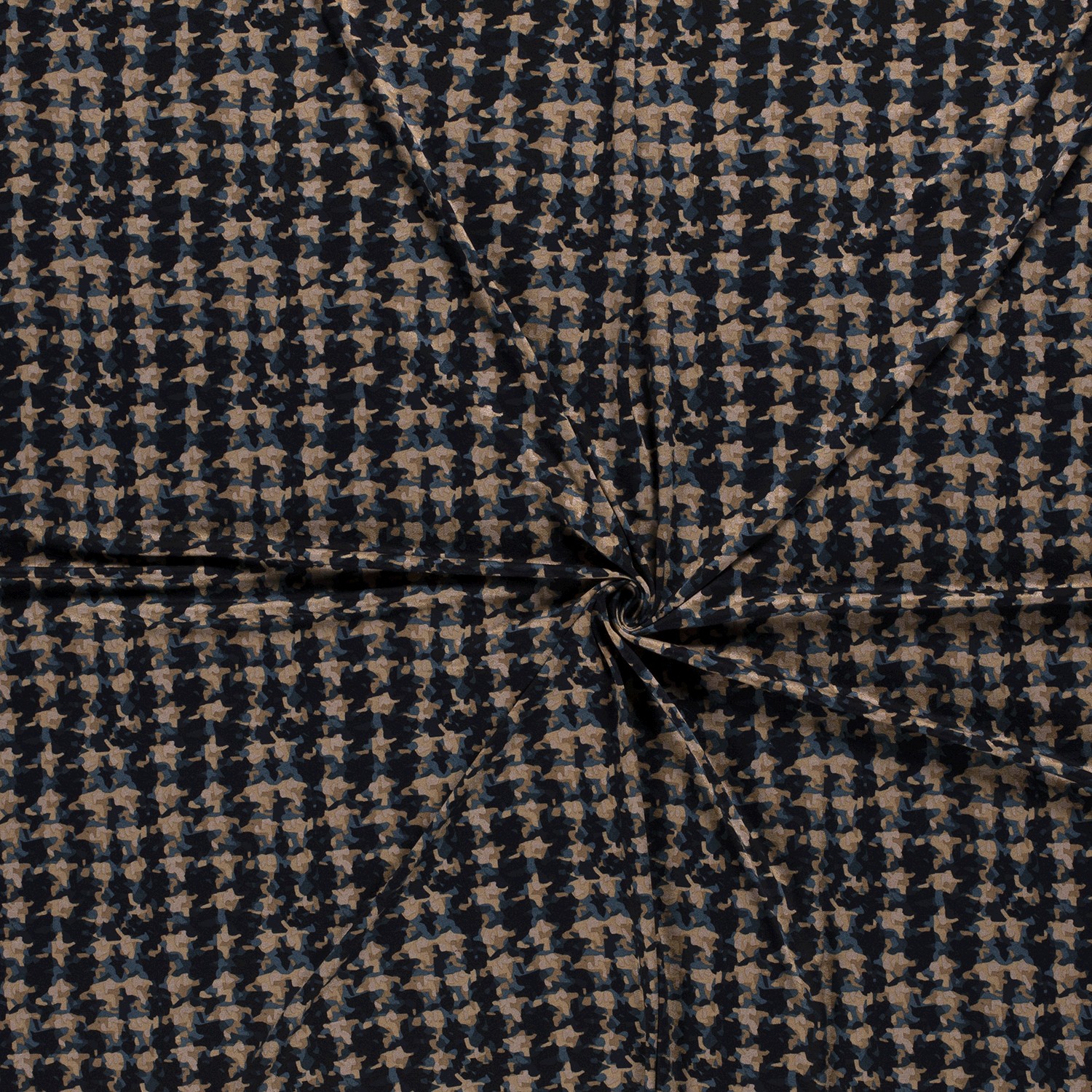 Denna viskosjersey förtrollar med en stilfull retrodesign i harmoniska beige- och blå toner. Fina, böljande linjer och grafiska element flätas samman och påminner om eleganta mönster från 60- och 70-talen – modernt tolkade och ändå tidlösa.