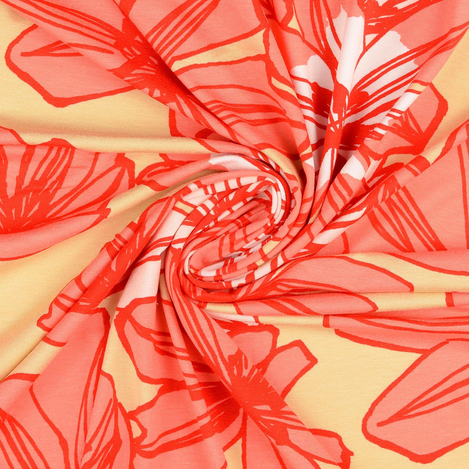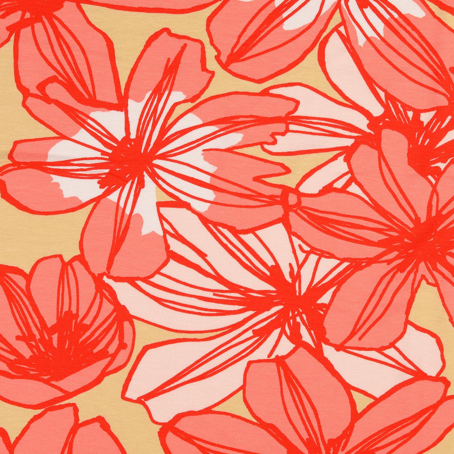 En mjuk sommarkänsla till din garderob: På en mjukt beige bakgrund blommar stora, detaljerat tecknade blommor i varma rosé- och bärtoner, tillsammans med fina blad i dämpade naturfärger. Den blommiga designen är elegant och feminin utan att vara påträngande – perfekt för dig som älskar romantiska mönster men ändå föredrar en stilren och lugn look.