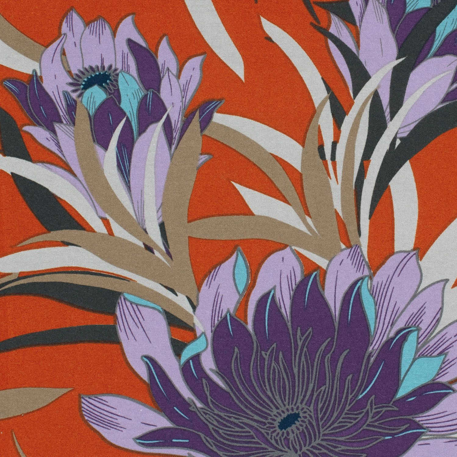 Tyg som en sensommarpromenad genom en frodig blomsterträdgård: på varm tegelröd blommar stora, detaljerade blommor i mjuka rosa och krämfärger, ackompanjerade av fina blad i dämpat grönt. Det blomsterinspirerade mönstret är både elegant och modernt – perfekt för alla som älskar feminina mönster med en touch av vintage-charm.