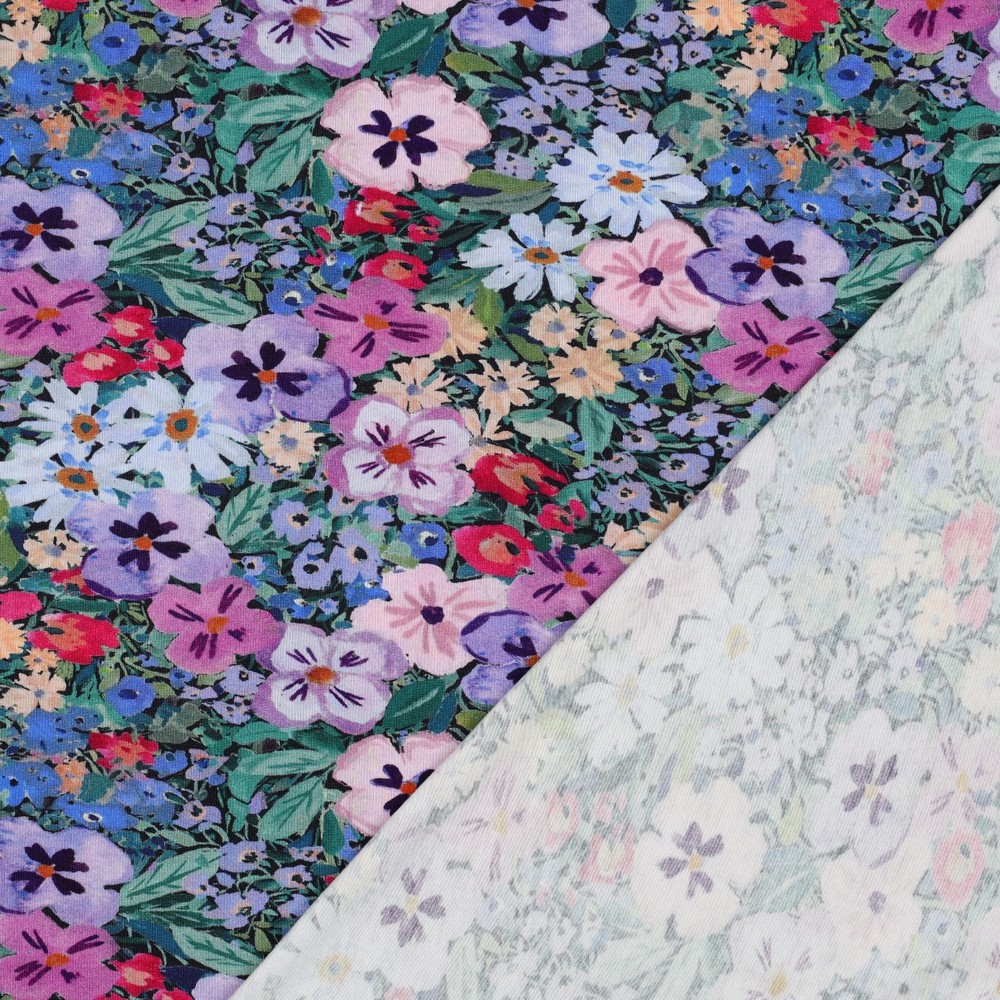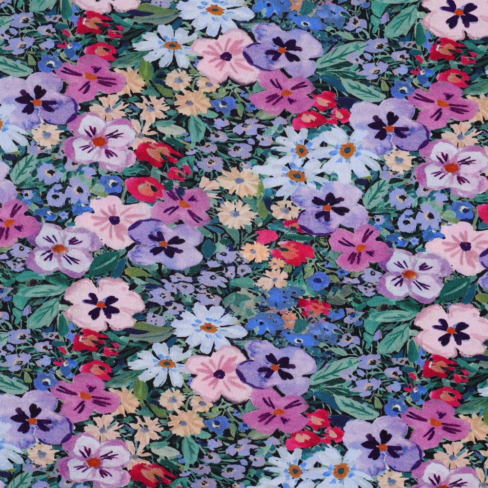 Viskosjersey - Violblommor i lila grönt